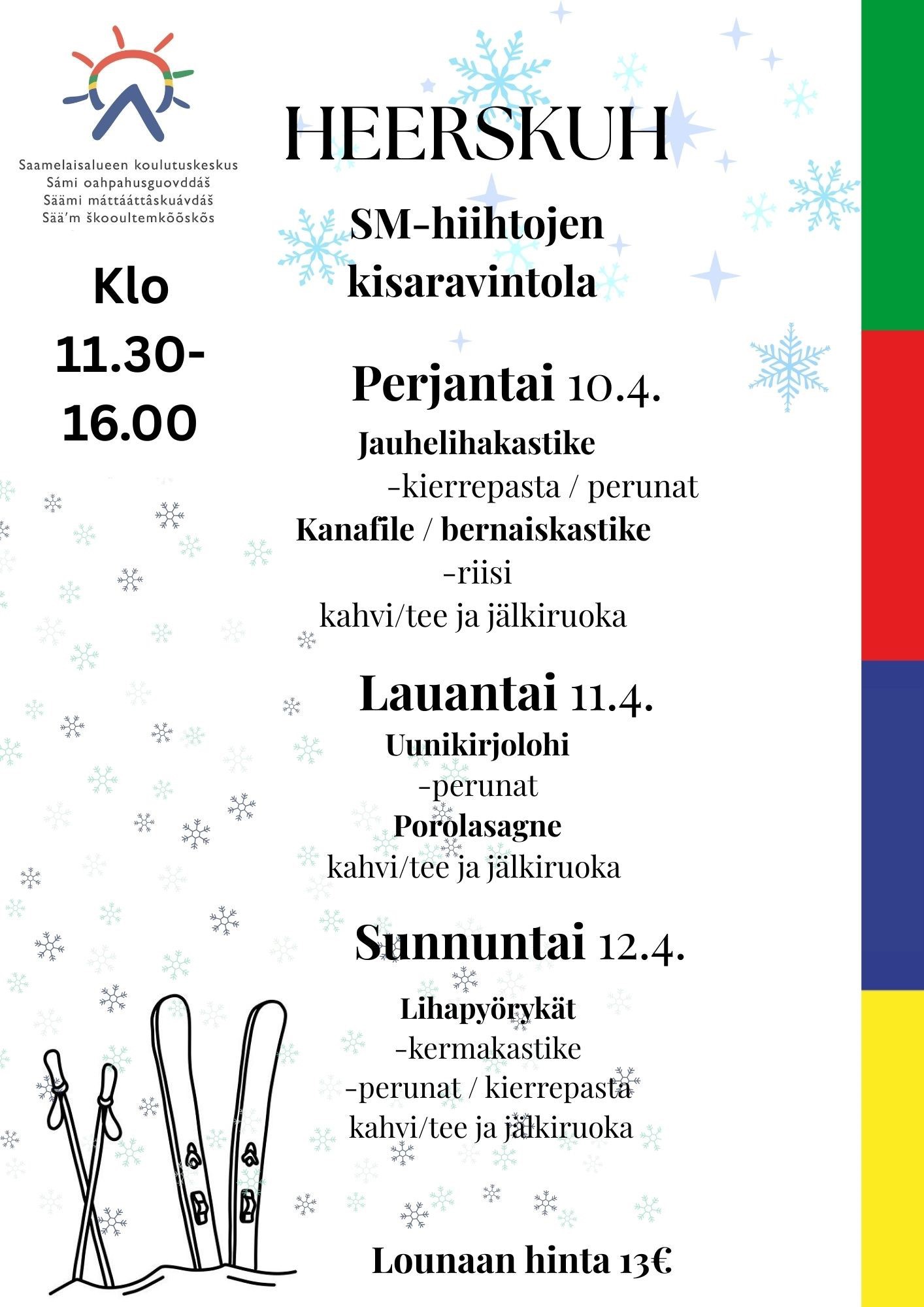 Julkaistu 26.3.2026 Muokattu 26.3.2026Opiskelijaravintola Heerskuh muuttuu SM-hiihtojen viikonloppuna kisojen viralliseksi lounasravintolaksi. Tervetuloa hiihtäjille, talkoolaisille, kyläläisille ja kannustajille nauttimaan lounasta kisapäivinä 10.-12.4. klo 11.30 alkaen. Lounastarjoilu kestää jokaisena päivänä klo 16 saakka. Lounaan hinta on 13€ ja lounas sisältää kahvin/teen ja jälkiruuan.