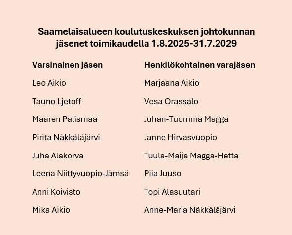 Julkaistu 25.9.2025 Muokattu 25.9.2025Opetushallitus on nimittänyt Saamelaisalueen koulutuskeskuksen uuden johtokunnan. Sen toimikausi on jo alkanut, mutta ensimmäinen kokous oli vielä tätä haastattelua tehtäessä edessäpäin.